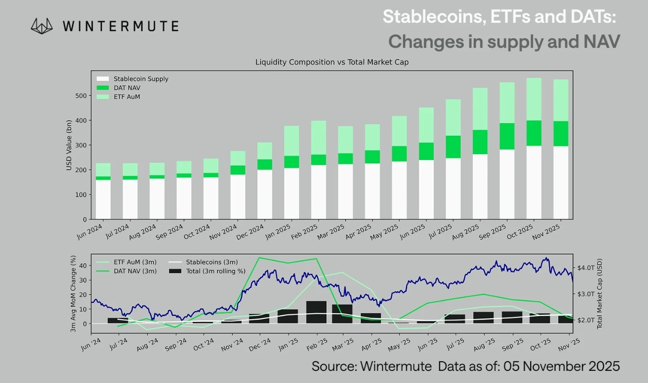 Volgens data van Wintermute groeiden deze drie categorieën sterk tussen 2024 en begin 2025: het gezamenlijke vermogen in ETF’s en DAT’s steeg van 40 miljard naar 270 miljard dollar, terwijl de uitgifte van stablecoins verdubbelde tot ongeveer 290 miljard dollar.