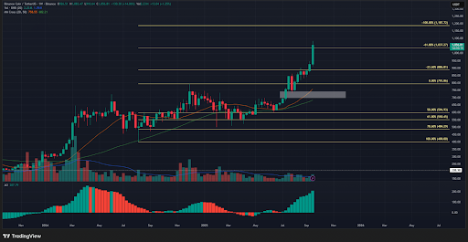 Na de recente doorbraak ligt het eerstvolgende target rond 1.200 dollar. Dit is het koersdoel van de consolidatiefase waarin BNB voor de uitbraak in handelde. De koers lijkt heel erg hard op weg naar dit niveau. Maar op de korte termijn zijn er echter ook steun- en liquiditeitszones te vinden. De regio rond 900 dollar vormt op de dagelijkse grafiek een belangrijke vraagzone. Bij een eventuele correctie is deze zone dus relevant.