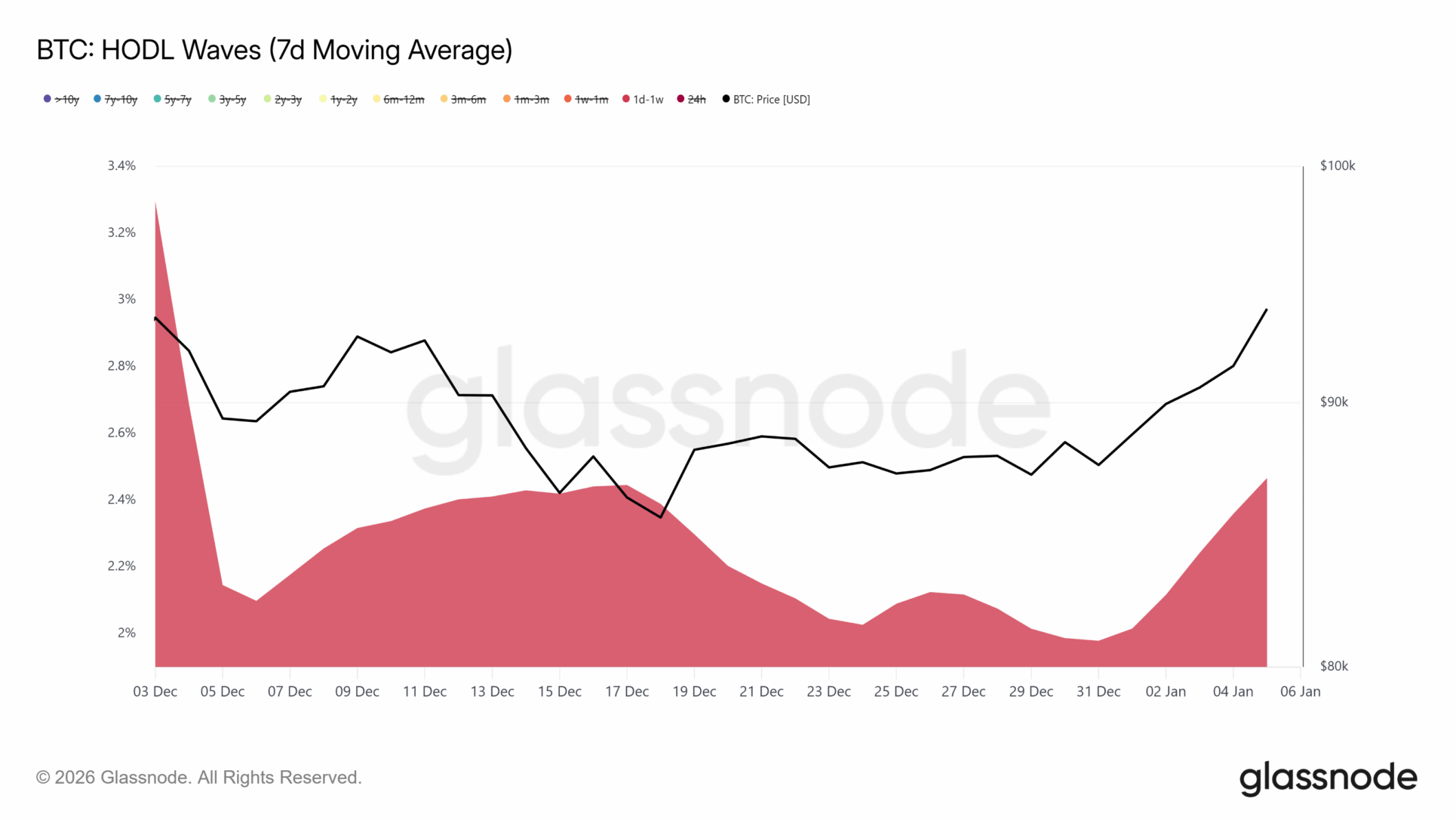 Opvallend is ook dat vooral kortetermijnbeleggers actief zijn aan de koopzijde. Het aandeel Bitcoin dat in handen is van beleggers die hun munten minder dan een week bezitten, is de afgelopen dagen duidelijk toegenomen. Dat wijst op nieuwe instroom van kapitaal, ondanks de al gestegen prijs.