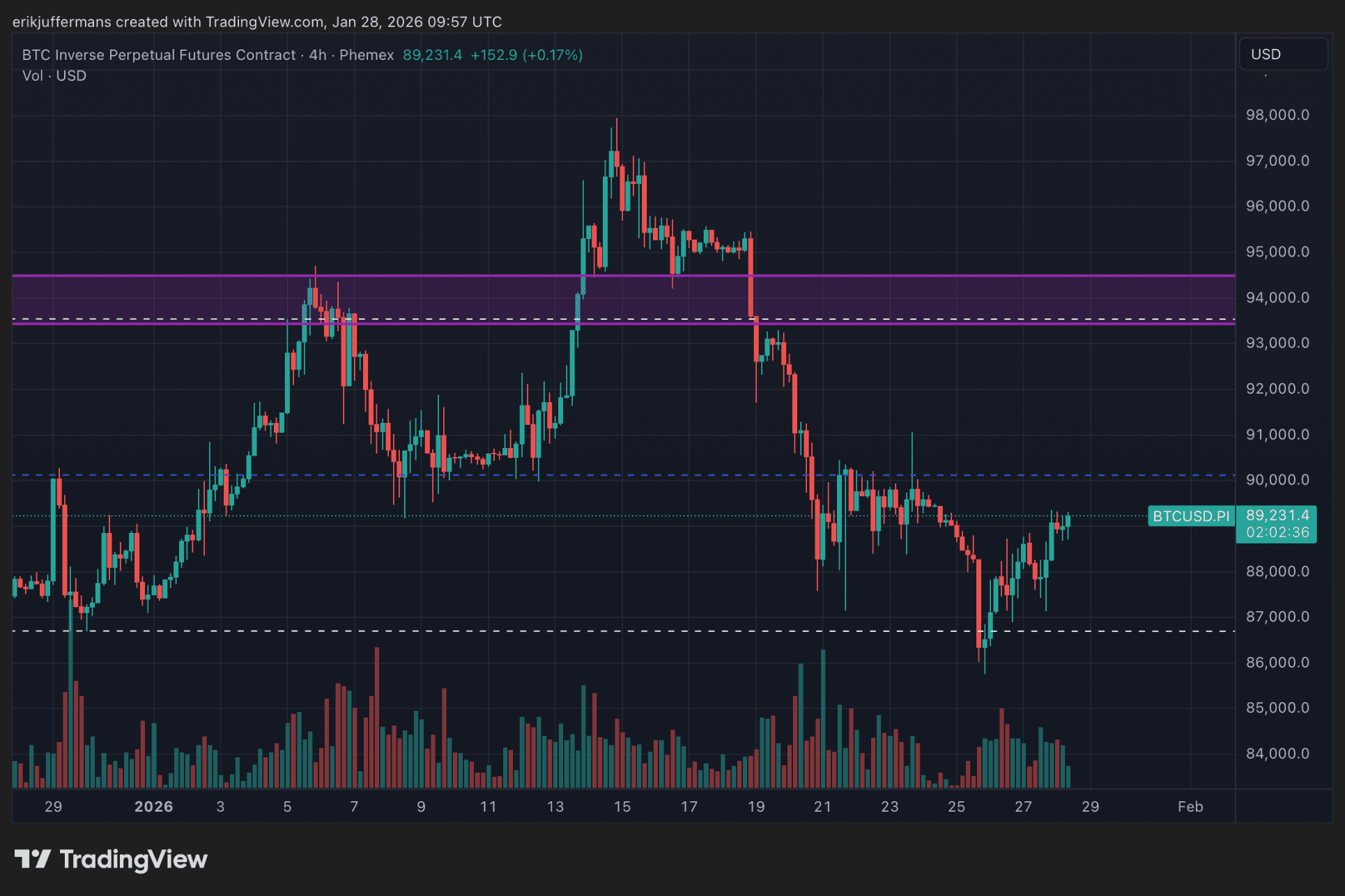 Eerst bekijken we de Bitcoin koers. Op de vier-uursgrafiek zien we de significante niveaus. Het niveau van 90.000 dollar is het niveau dat de bulls moeten veroveren. Bij een gunstige persconferentie zou dit niveau vanavond al op de proef gesteld kunnen worden.