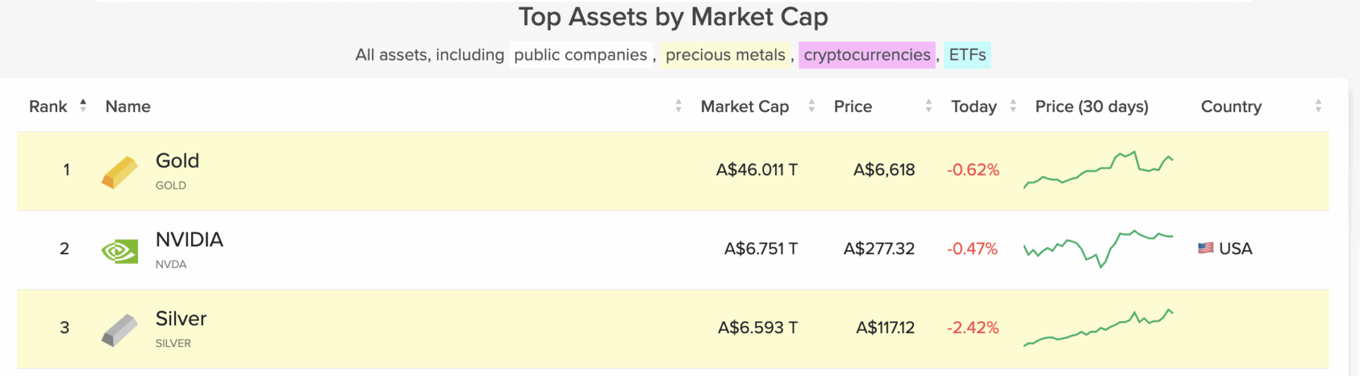 Volgens cijfers van databedrijf CompaniesMarketCap bedraagt de totale marktwaarde van goud momenteel circa 31,1 biljoen dollar, waarmee het stevig op de eerste plaats staat.