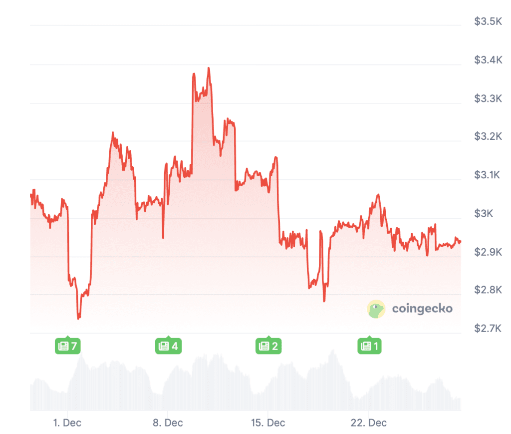 Op het moment van schrijven laat de koers van ethereum weinig kracht zien. De munt is in de afgelopen 24 uur stabiel gebleven, maar koerst bijna 2 procent lager dan een week geleden en 4 procent lager dan vorige maand. Op het moment van schrijven is ethereum 2.939 dollar waard.