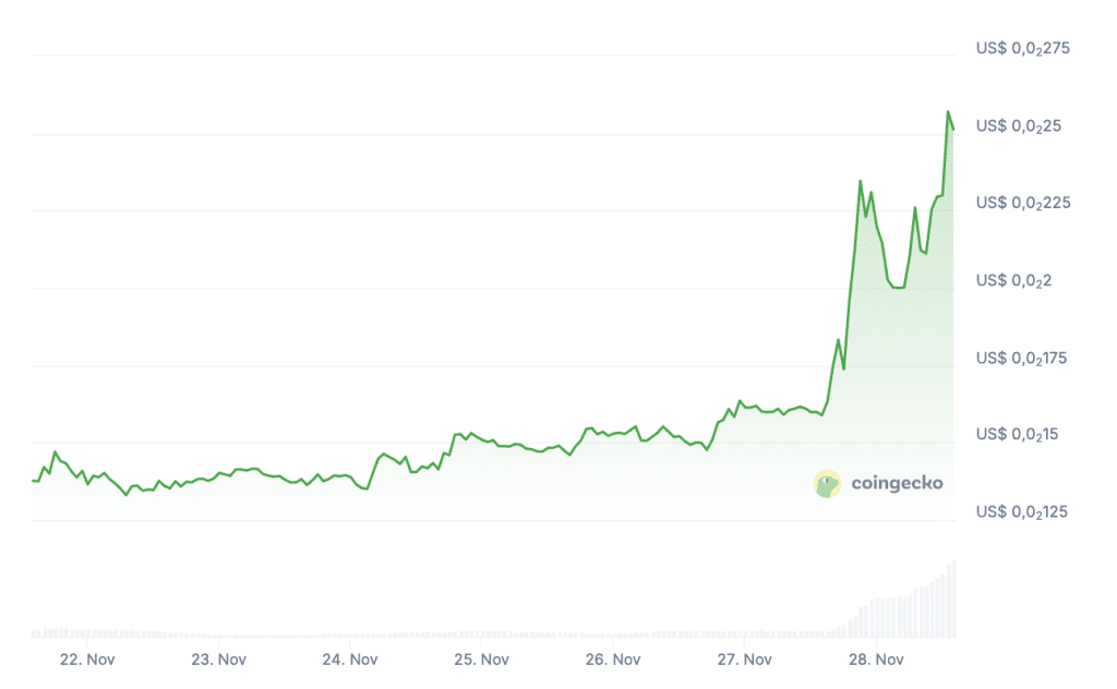 De token boekte spectaculaire successen in 2024, toen de koers in de maand mei explodeerde met ruim 1.700 procent. Latere stijgingen brachten de koers uiteindelijk nog iets hoger, naar een hoogtepunt van 0,0135 dollar. Sinds het begin van 2025 leek de stoom er echter uit en daalde de koers met zo’n 90 procent, helemaal terug naar 0,00136 dollar.