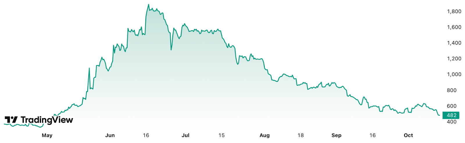 De afgelopen maanden zit het aandeel Metaplanet in een duidelijke neerwaartse trend. Sinds juni is het met maar liefst 73,5 procent gedaald. Die koersval lijkt sterk samen te hangen met zorgen over verwatering.