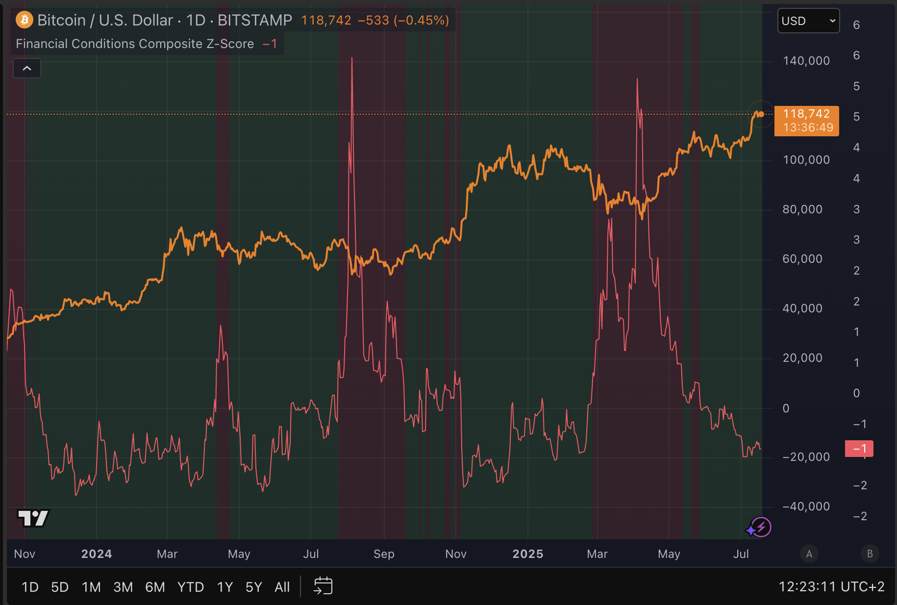 De onderstaande grafiek toont deze dynamiek, waarbij een daling van de rode lijn aangeeft dat de Financial Conditions versoepelen. Sinds de bodem van april zijn de financiële omstandigheden extreem verbeterd.