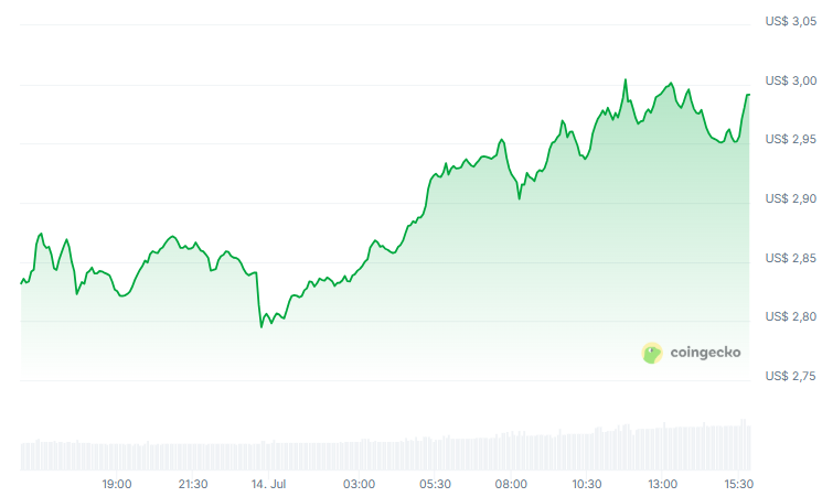 De stijgende vraag naar XRP heeft de koers flink opgestuwd. Begin juni stond de munt nog op 1,93 dollar, maar inmiddels is dat 3,00 dollar – een stijging van 56 procent in minder dan een maand.