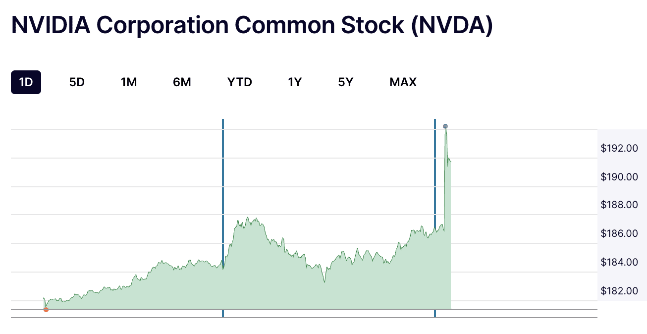• Het aandeel Nvidia steeg na het nieuws van $181 naar $192, wat de bredere aandelenmarkt positief beïnvloedde.