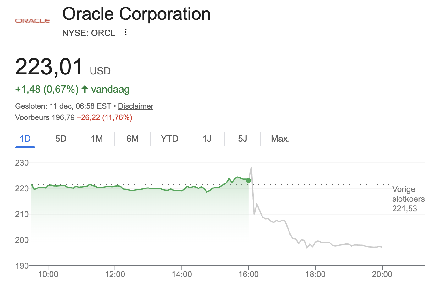 Oracle krijgt forse klap na tegenvallende kwartaalcijfers. Het aandeel kelderde woensdag met elf procent in de nabeurshandel, nadat de omzet lager uitviel dan verwacht. Ondanks groei in de clouddivisie blijft er twijfel over de waardering van techbedrijven die zwaar inzetten op kunstmatige intelligentie.