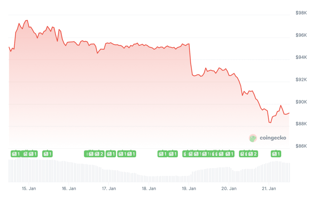 Crypto en ook andere financiële markten kregen de afgelopen dagen weer flinke klappen te verduren. Als gevolg van internationale spanningen rond Groenland en dreigementen van president Trump over nieuwe importheffingen heerst er veel onzekerheid op financiële markten. Veel beleggers trokken hun geld uit de markt, met dalende koersen als gevolg.
