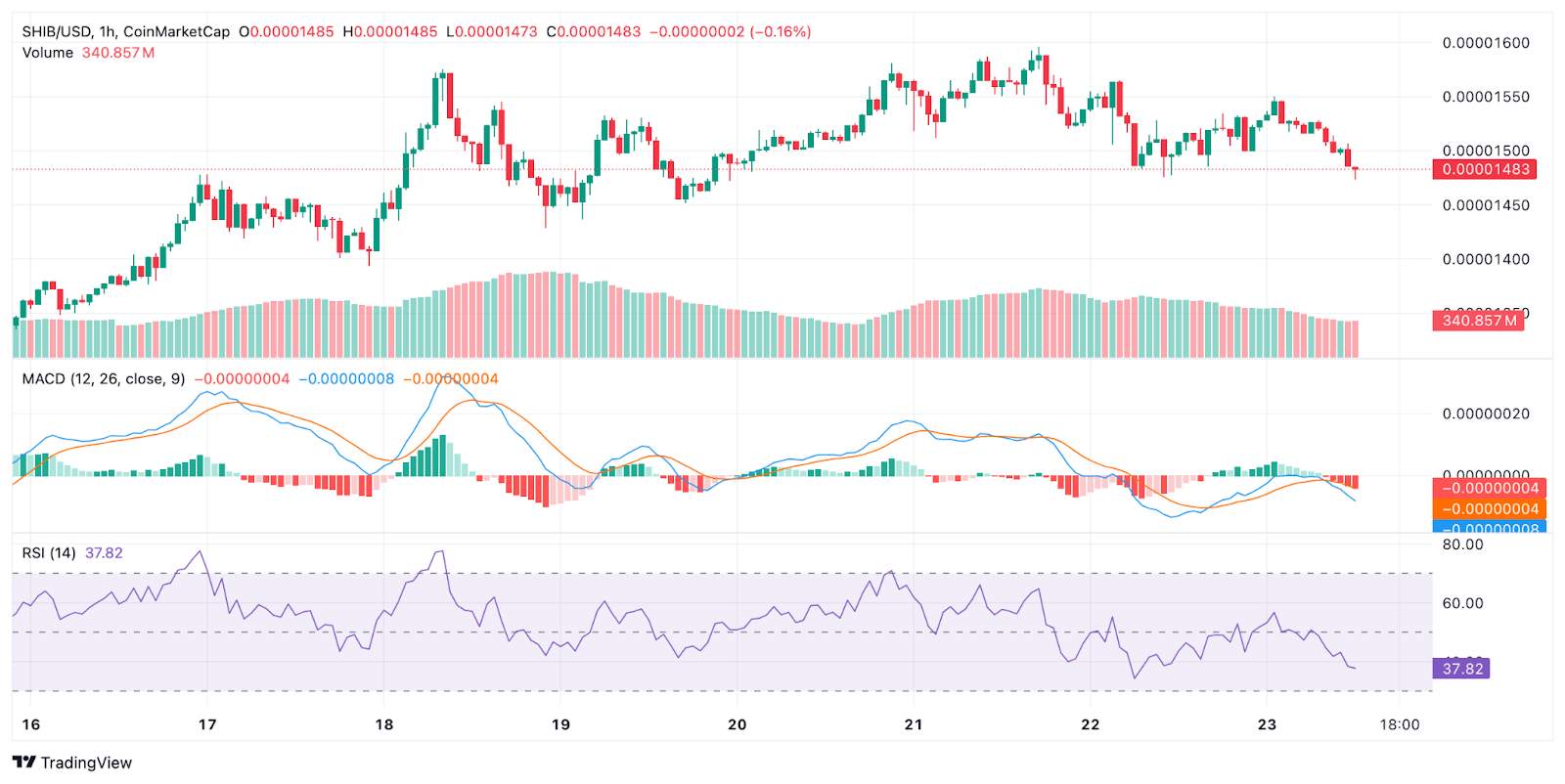 Hoewel de Shiba Inu koers op dit moment lichtelijk gedaald is, is het sentiment rondom Shiba Inu nog erg positief. De daling heeft te maken met een kleine dip op de markt. Zowel de MACD als de RSI laten lichte bearish bewegingen zien, zonder echte paniek.