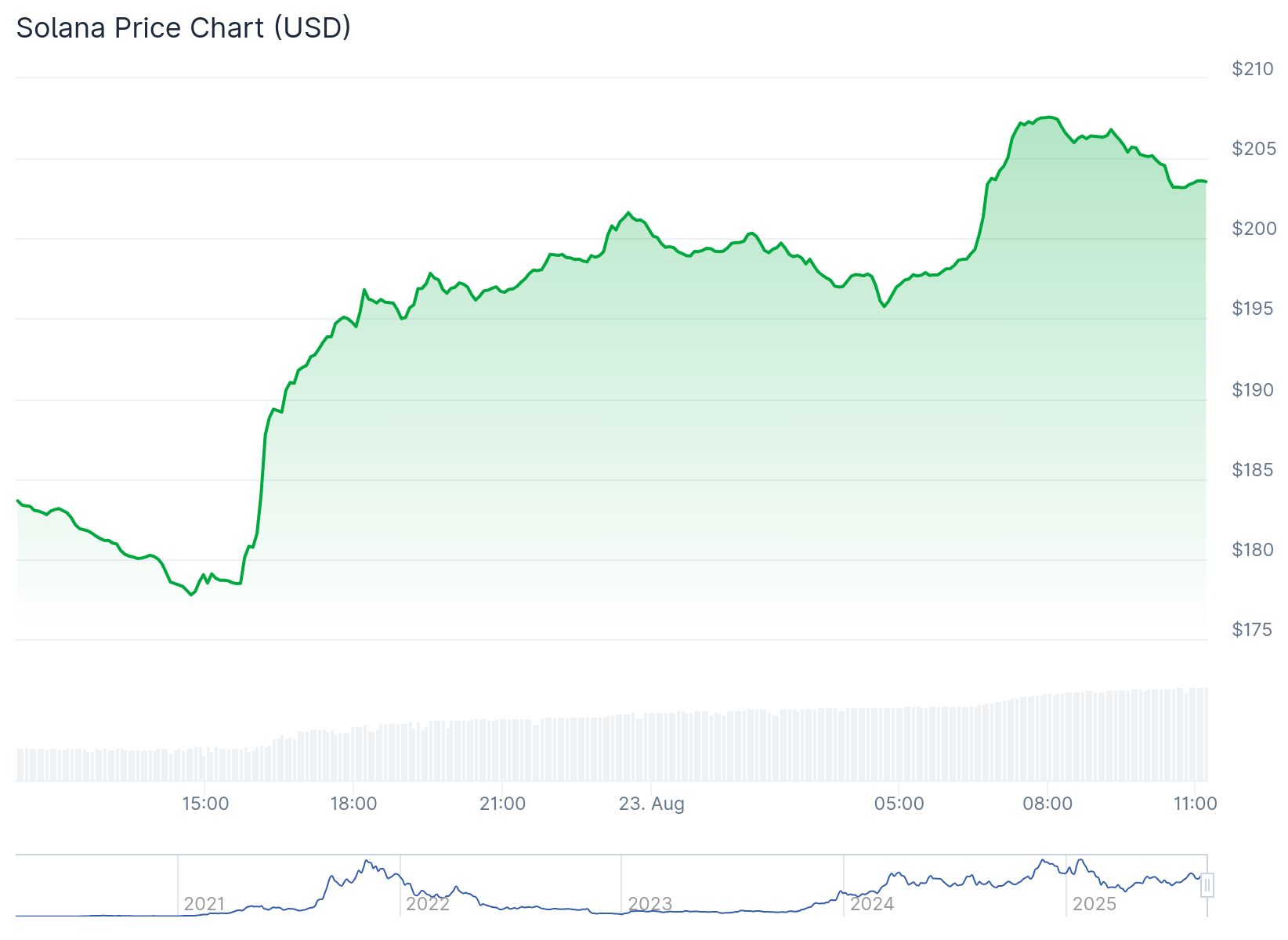Solana is verder gestegen tot boven de 200 dollar. Vanochtend werd het hoogste punt bereikt van 208 dollar. Dat is maar liefst 15,5 procent hoger dan de 180 dollar van gistermiddag.