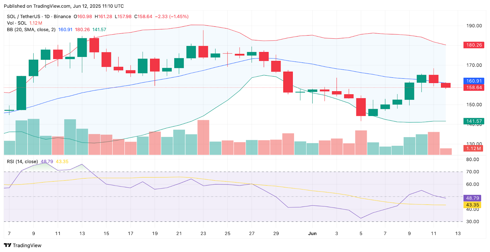 De technische analyse van Solana laat een interessant kantelpunt zien. De RSI laat momenteel een neutrale zone zien, en wijst erop dat investeerders een afwachtende houding hebben. De RSI laat wel een lichte stijging zien, wat signaleert dat de Solana koers langzaam weer momentum opbouwt zonder een echt sterke trend. Dit lijkt op een moment van adempauze voor de Solana koers.