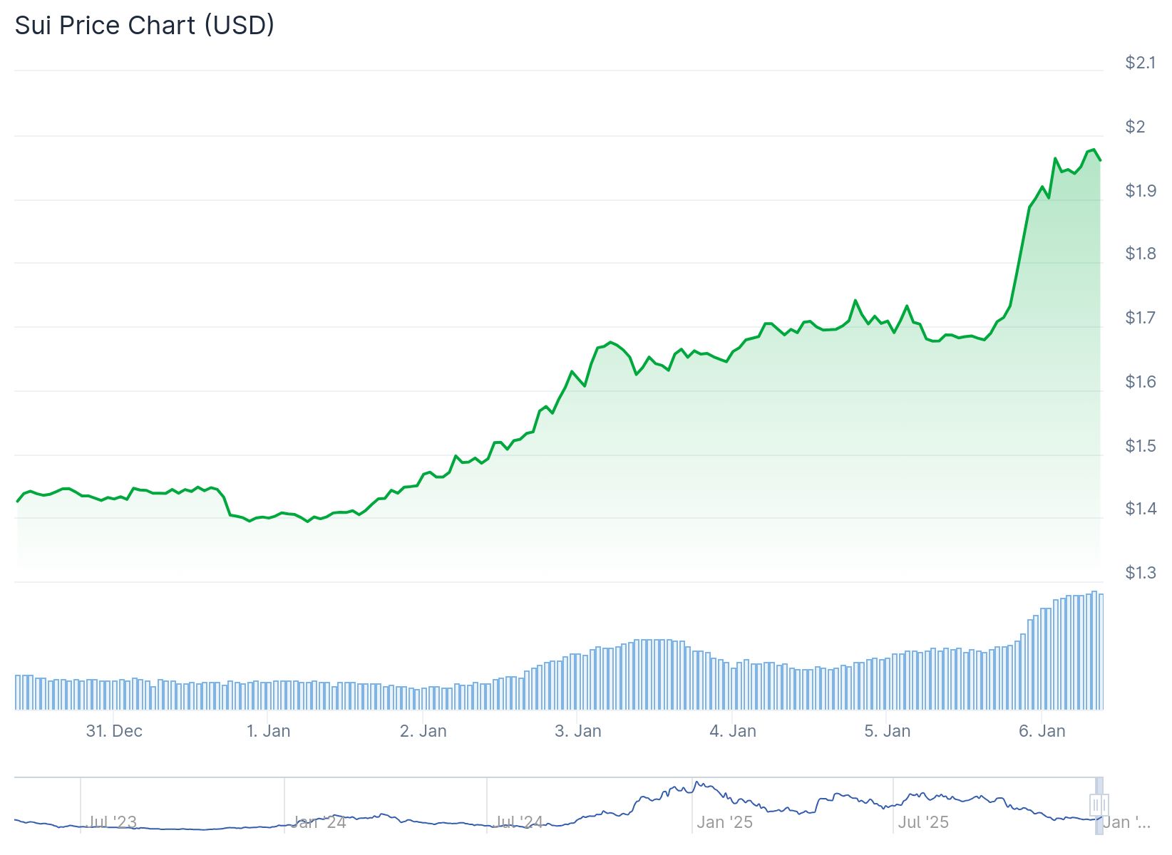 De Sui koers is het nieuwe jaar krachtig begonnen. In de afgelopen 24 uur steeg de prijs met 17,7 procent. Sinds 1 januari is er zelfs sprake van een totale winst van bijna 41 procent. Daarmee hoort SUI op dit moment tot de best presterende cryptomunten van de markt.