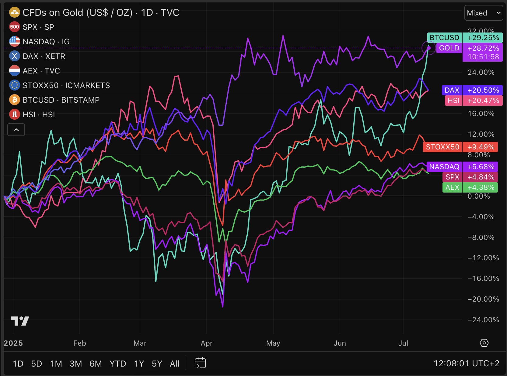 Over het gehele jaar 2025 gemeten is Bitcoin nu zelfs de best presterende asset-klasse ter wereld. Goud was lange tijd de koning van 2025, maar inmiddels is de digitale munt weer op de troon geklommen, terwijl er in april nog een negatief jaarrendement van bijna -20 procent op de borden stond.