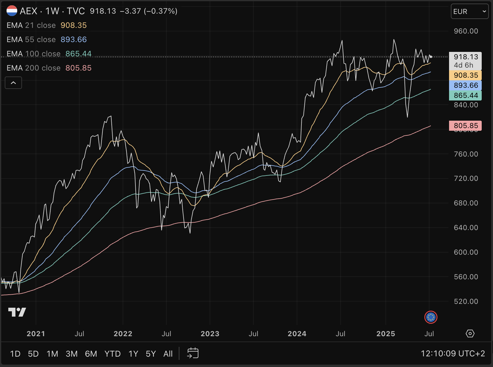 Het grote plaatje blijft wél bullish voor de AEX. Hieronder zien we de weekgrafiek met een aantal belangrijke exponentiële bewegende gemiddelden (EMAs).