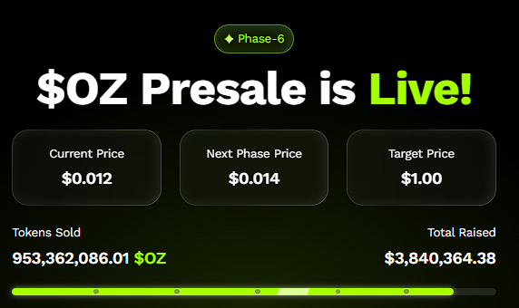 Ozak AI is razendsnel uitgegroeid tot een van de meest veelbelovende tokens in een vroeg stadium, met flinke interesse van crypto-whales en strategische investeerders. Met een tokenprijs van slechts $0,0012 in de OZ-presale heeft Ozak AI al meer dan $3,8 miljoen opgehaald en zijn er meer dan 950 miljoen tokens verkocht — een duidelijk signaal dat het slimme geld vroegtijdig positie inneemt.
