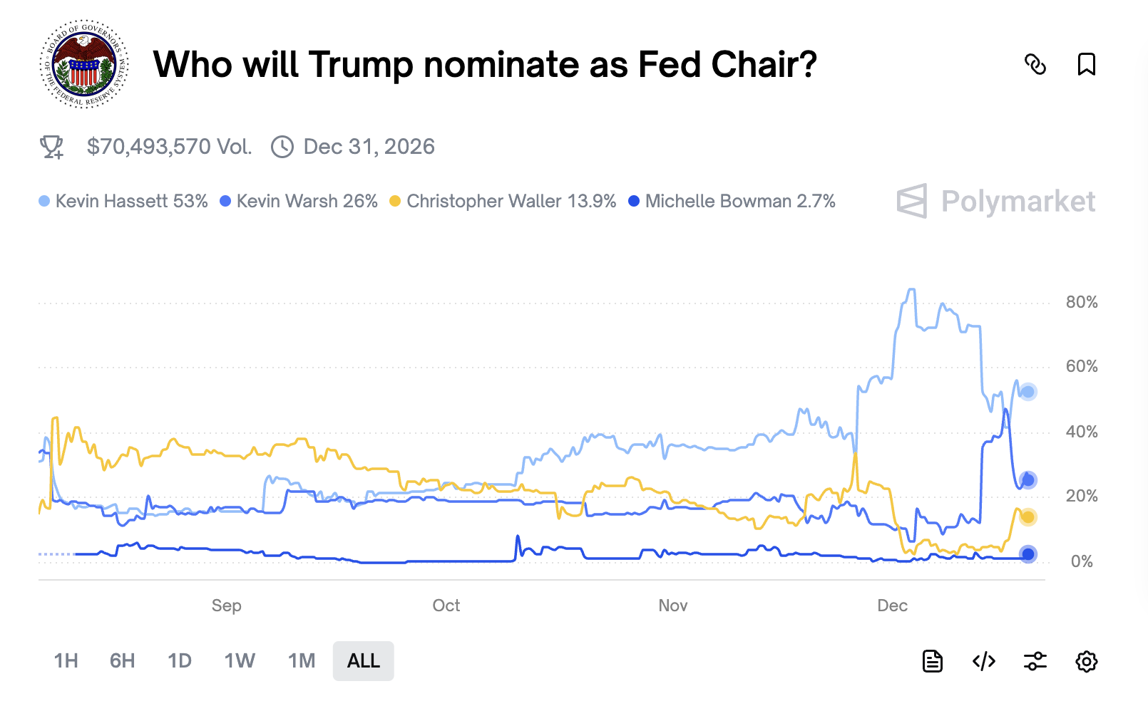 Op voorspellingsplatform Polymarket wordt momenteel gerekend op meerdere kanshebbers. De meeste kans wordt toegeschreven aan Kevin Hassett, economisch adviseur van het Witte Huis, met een geschatte kans van ruim 53 procent. Oud-Fed-bestuurder Kevin Warsh volgt met ongeveer 26 procent. Chris Waller staat derde met circa 14 procent.
