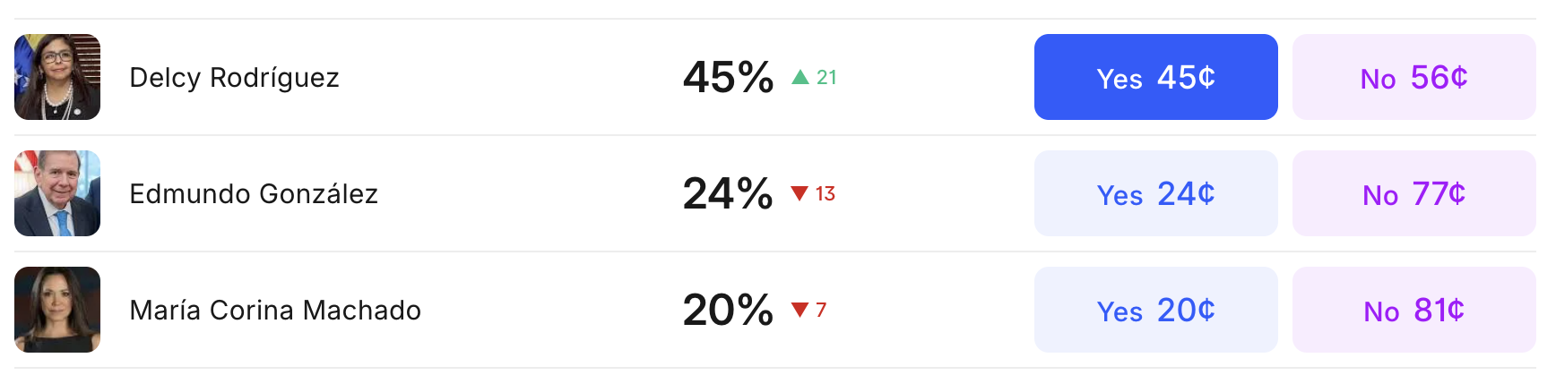 Machado, die in 2025 de Nobelprijs voor de Vrede ontving, is al jaren een uitgesproken tegenstander van het Maduro-regime. Volgens het voorspellingsplatform Kalshi maakt zij kans om eind 2026 aan de macht te komen. Ze staat momenteel op de derde plaats met 27 procent. De voorlopige koploper is Delcy Rodríguez met 42 procent, gevolgd door Edmundo González met 28 procent.