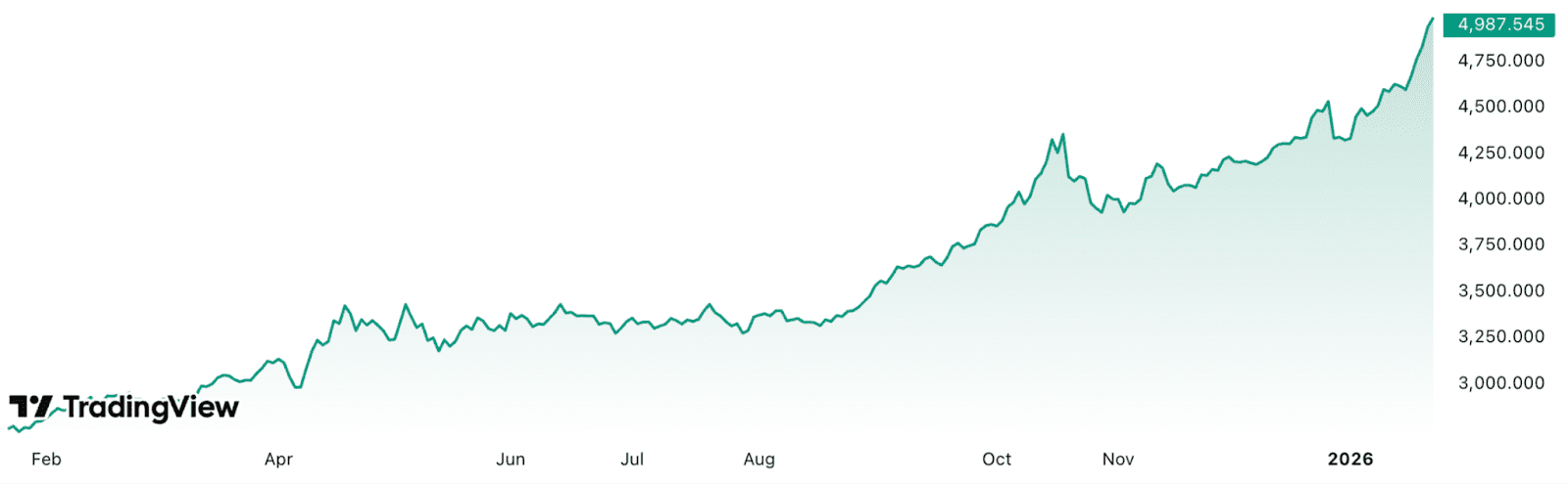 Tegelijkertijd stijgt de goudprijs onverminderd door. Het edelmetaal vestigde afgelopen vrijdag een nieuw record van ongeveer 4.987 dollar per ounce, een stijging van liefst 90 procent sinds begin vorig jaar. Goud lijkt daarmee zijn status als ultieme veilige haven te bevestigen.