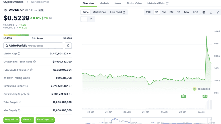 Na de geruchten steeg de prijs van Worldcoin (WLD) van 0,46 dollar naar 0,63 dollar, een stijging van ongeveeer 40%. Op het moment van schrijven is de prijs weer terug op ongeveer 0,52 dollar.