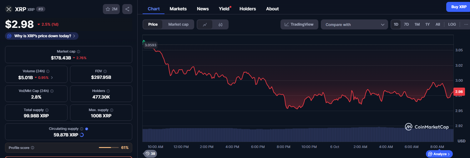 Op het moment van schrijven wordt XRP verhandeld rond de $3,00, een stijging van ongeveer 4,6% in de afgelopen week. Deze stijging komt terwijl experts verwachten dat de SEC later deze maand een spot-ETF voor XRP zou kunnen goedkeuren. Recente aanvragen van Grayscale, 21Shares en WisdomTree tonen aan dat grote beleggers staan te popelen om blootstelling aan XRP te krijgen. Volgens gegevens van CoinMarketCap heeft XRP een marktkapitalisatie van ongeveer $170 miljard, waarmee het tot de top vijf van cryptocurrencies behoort.