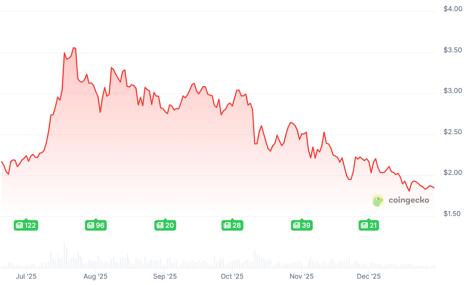 Wie uitzoomt, ziet een pijnlijke terugval. XRP handelt momenteel rond de 1,86 dollar, terwijl de munt in juli nog piekte op 3,65 dollar. Dat is een daling van 49 procent.