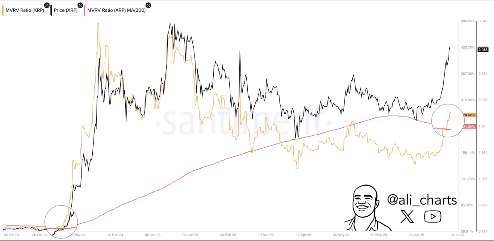 De XRP koers is deze week met ruim 35 procent gestegen en laat daarmee zowel Bitcoin (5 procent) als Ethereum (22 procent) duidelijk achter zich. Volgens analist Ali Martinez, bekend als ‘Ali Charts’, heeft de MVRV-ratio (Market Value to Realized Value) een zogeheten ‘golden cross’ gevormd.