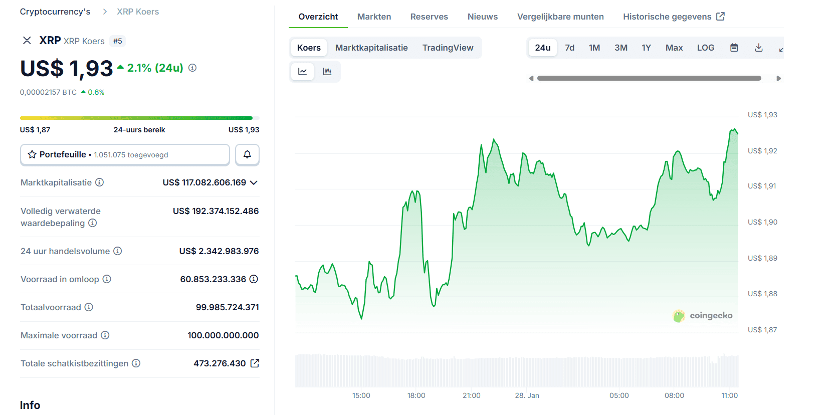 De trendlijn ligt rond 1,97 dollar. Breekt XRP overtuigend boven dit niveau, dan kan de korte termijntrend kantelen.