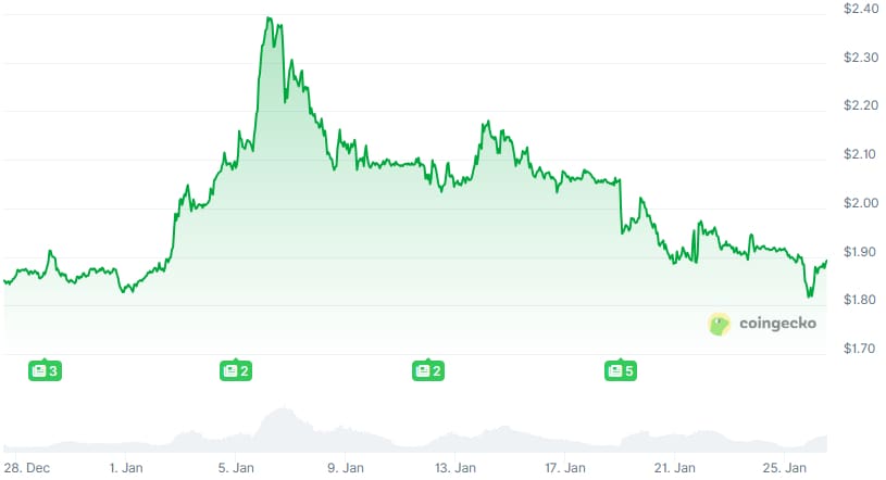 Deze ontwikkeling valt samen met de recente koersdaling. XRP begon het jaar sterk met een stijging naar 2,40 dollar (2,02 euro).
