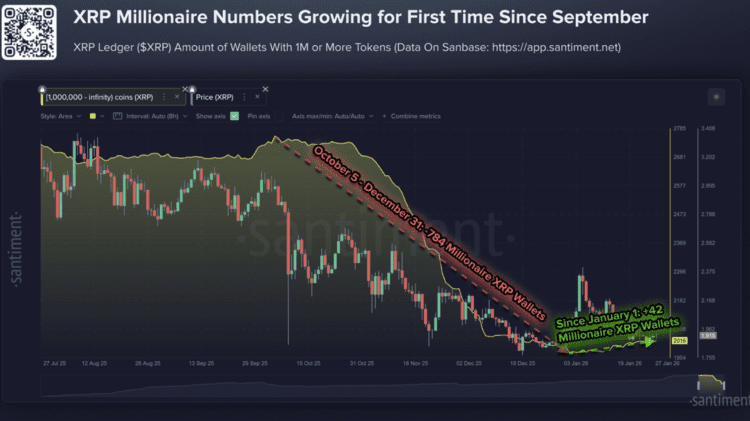 Volgens onderzoeksplatform Santiment, een bedrijf dat gegevens uit de cryptomarkt analyseert, is het aantal XRP wallets met meer dan 1 miljoen tokens gestegen sinds het begin van 2026. Bij de huidige koers is 1 miljoen XRP ongeveer 1,7 miljoen euro waard.