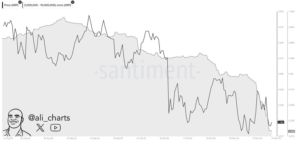 De koers van XRP krijgt te maken met sterke verkoopdruk. De bekende analist Ali Martinez deelt op X dat grote beleggers maar liefst 200 miljoen XRP hebben verkocht in slechts 48 uur.