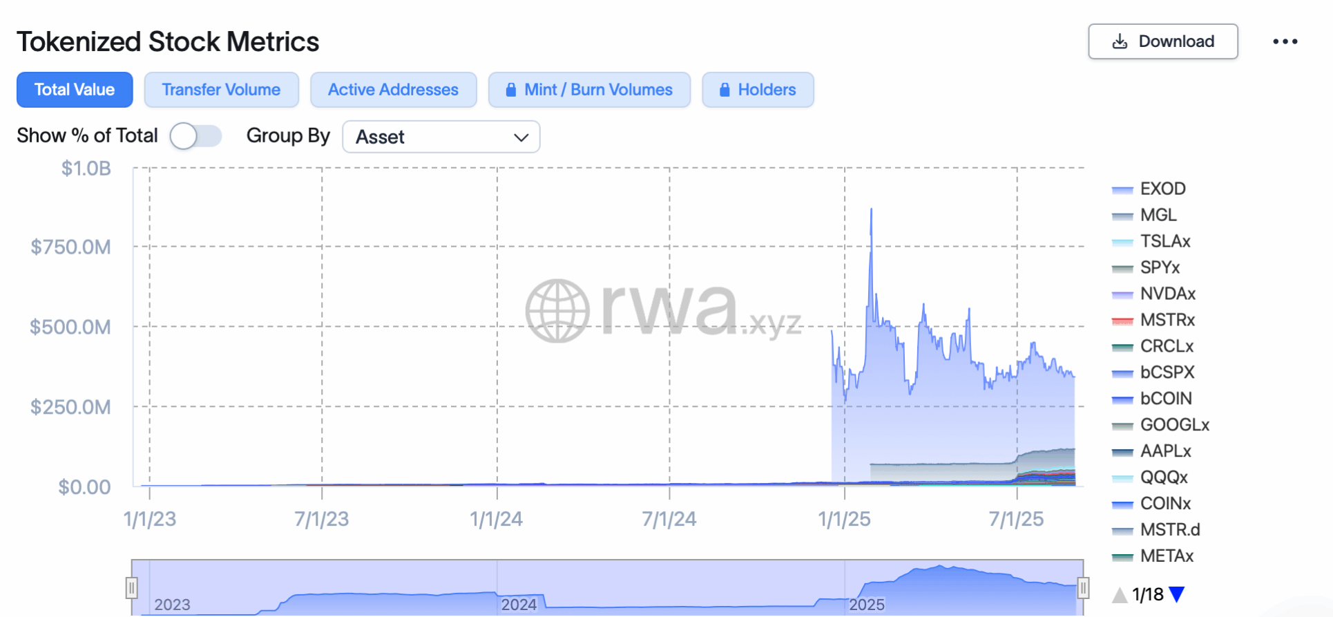 Volgens cijfers van RWA.xyz vertegenwoordigen tokenized aandelen momenteel een marktwaarde van 342 miljoen dollar. Dat is slechts 1,2 procent van de totale markt voor tokenized real world assets, die wordt geschat op 27,9 miljard dollar.