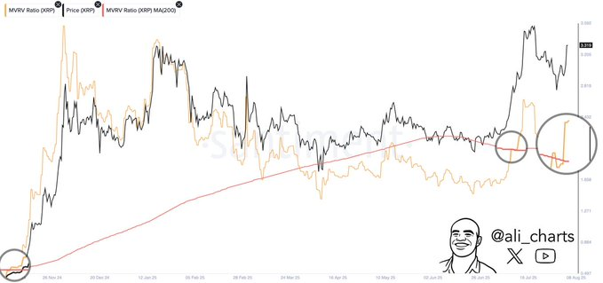 Volgens cryptohandelaar Ali Martinez heeft XRP een golden cross gevormd in de Market Value to Realized Value (MVRV)-ratio. Dit gebeurt wanneer de kortetermijn-MVRV boven het 200-daags gemiddelde uitkomt. Het signaal is zeldzaam en verscheen de afgelopen jaren slechts twee keer eerder – beide keren gevolgd door forse stijgingen van 54 procent en zelfs 630 procent.