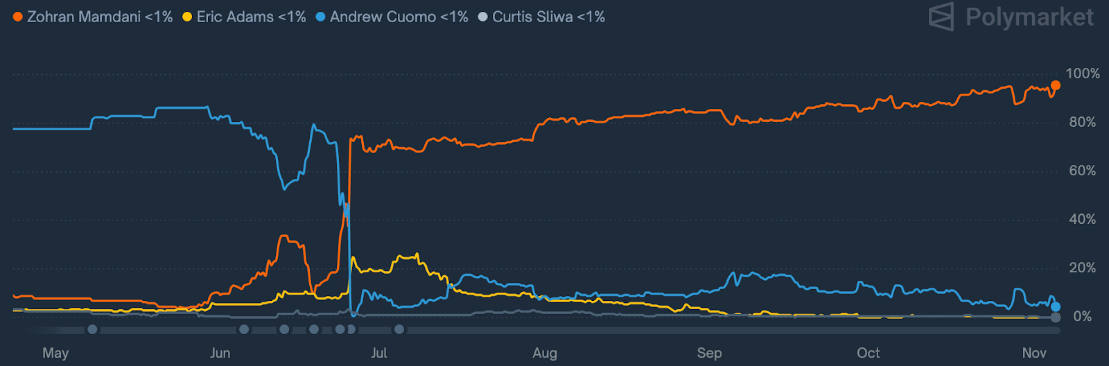Op de cryptomarkt Polymarket werd de uitslag al weken van tevoren voorspeld. Daar zette ruim 92 procent van de deelnemers hun geld op een overwinning van Mamdani. Zijn kansen begonnen nog laag, met slechts 9,7 procent begin juni. Maar binnen twee weken steeg dat naar ruim 73 procent, waarna het vertrouwen in zijn zege gestaag verder groeide.